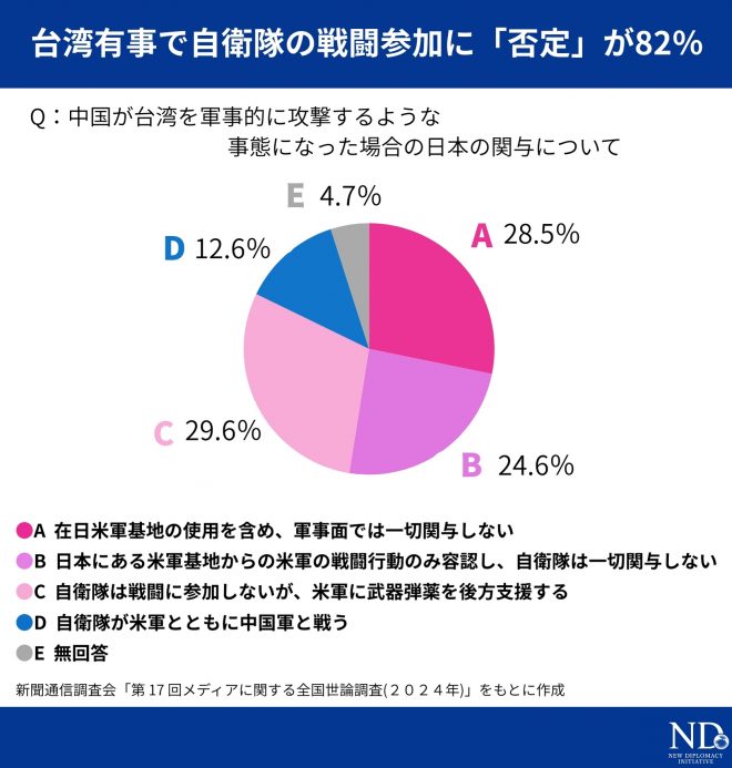 続けて、新聞通信調査会が実施した世論調査の結果が紹介されました。「中国が台湾を軍事的に攻撃した場合の日本の関与は」という質問に対する四つの選択肢への回答が映し出され「自衛隊が米軍とともに中国軍と戦う」が12・6%しかなかったことが示されました(2024年実施)。