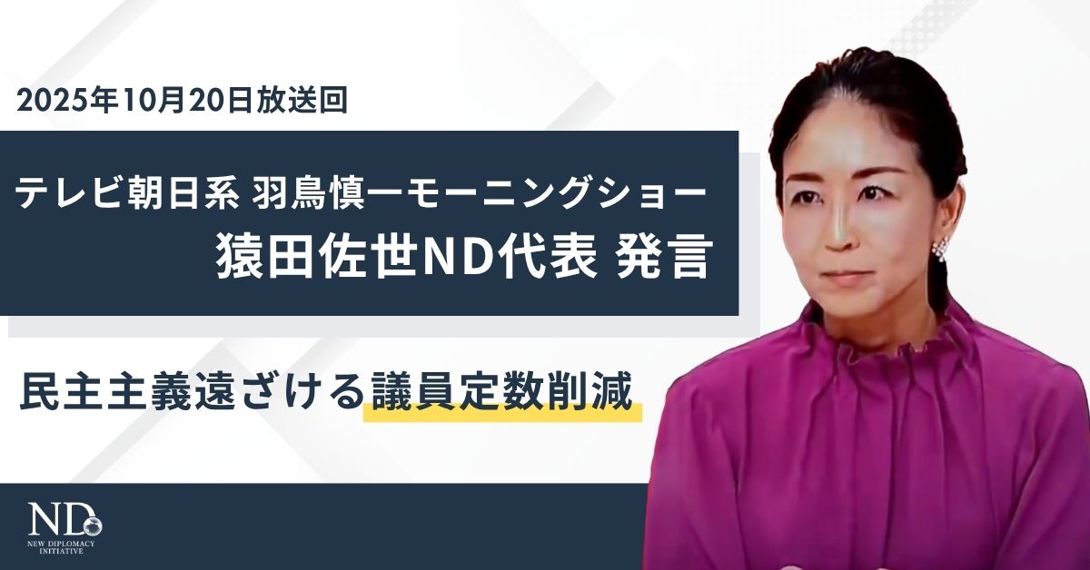 新外交イニシアティブ(ND)の猿田佐世代表が10月20日のテレビ朝日「羽鳥慎一モーニングショー」に出演しました。パネルを使って議論するメインのコーナーでは、自民と維新が連立に向けた合意書に調印する見込みとなり、自民党の高市早苗総裁が明日21日に行われる首相指名選挙で女性初の首相に選出される可能性が濃厚な状況の中、維新が連立の条件として求めた議員定数の削減が及ぼす影響に焦点が当てられました。