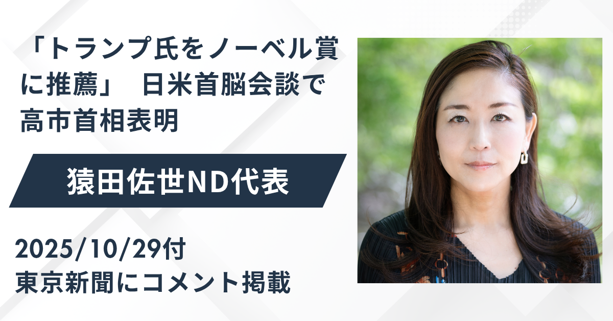 10月28日に開かれた日米首脳会談において、高市早苗首相がトランプ大統領をノーベル平和賞の候補に推薦すると伝えたことに関し、猿田佐世ND代表のコメントが10月29日付の東京新聞に掲載されました。