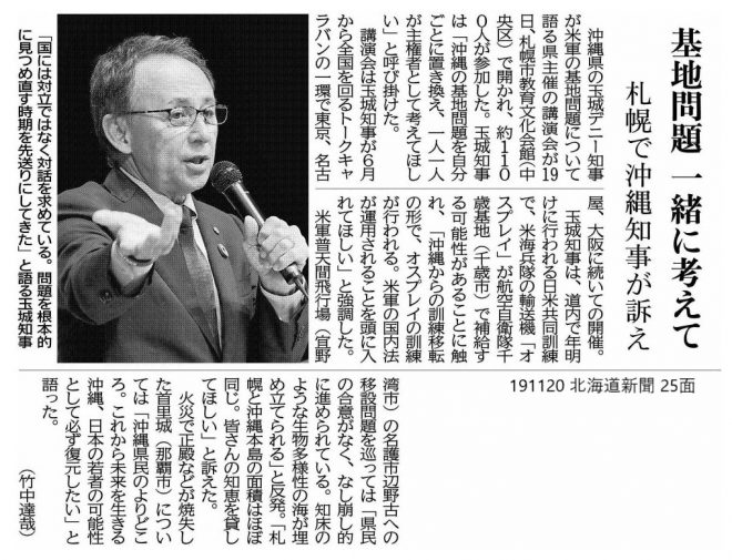 【基地問題一緒に考えて 札幌で玉城知事が訴え】(北海道新聞 11/20)