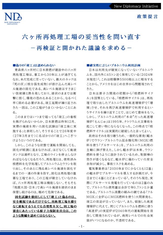 六ヶ所再処理工場はまだ、本格運転に入っていない。日本政府は、後世に禍根を残すことのないよう、再処理の妥当性について議論を尽くし、合理的な判断を下すべきである。