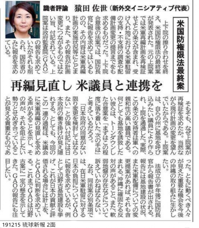 保護中: 米国防権限法最終案 再編見直し 米議員と連携を